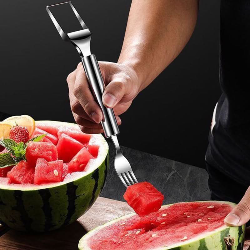 2-IN-1 ONTWERP: Dit innovatieve gereedschap combineert een vork en een snijder, waardoor u moeiteloos watermeloen of ander fruit in perfecte blokjes snijdt. U kunt ze vervolgens oppakken en eten, zodat uw tafel schoon en volledig druppelvrij blijft.