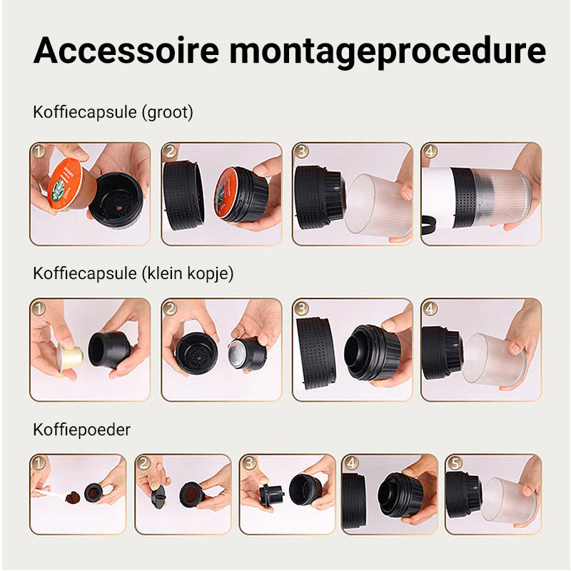 3-in-1 BREWING SYSTEEM - Dit draagbare koffiezetapparaat is compatibel met koffiepoeder, grote kop capsules en kleine kop capsules. Geniet van elk type koffie met één apparaat, waardoor het perfect is voor koffieliefhebbers die van afwisseling en gemak houden.