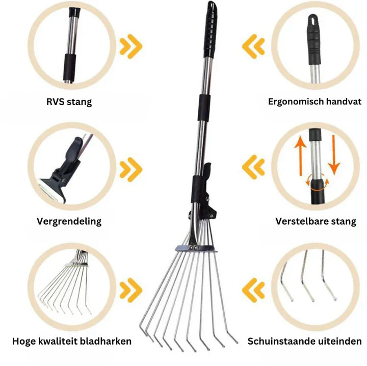Efficiënte blad- en afvalverzameling: De intrekbare bladhark heeft stevige, goed geplaatste tanden en verzamelt efficiënt bladeren, gemaaid gras en ander tuinafval. De brede harkkop bestrijkt meer grond, waardoor je minder tijd en moeite nodig hebt om je tuin schoon te houden.