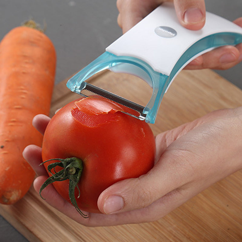 ERGONOMISCH COMFORTABEL HANDVAT: Voorzien van een gebogen, goed ontworpen handvat dat natuurlijk in de hand ligt, voor een veilige en comfortabele grip die zorgt voor betere controle en stabiliteit tijdens het schillen.