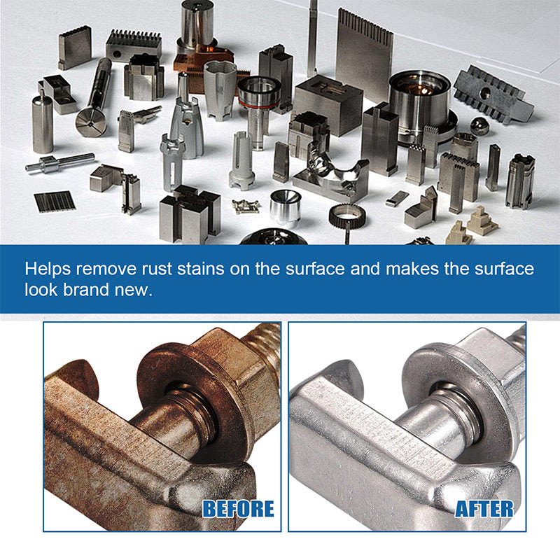 Niet-giftige formule: geformuleerd met veilige ingrediënten die roest effectief verwijderen en tegelijkertijd het metaal en de omgeving beschermen tegen schadelijke effecten.