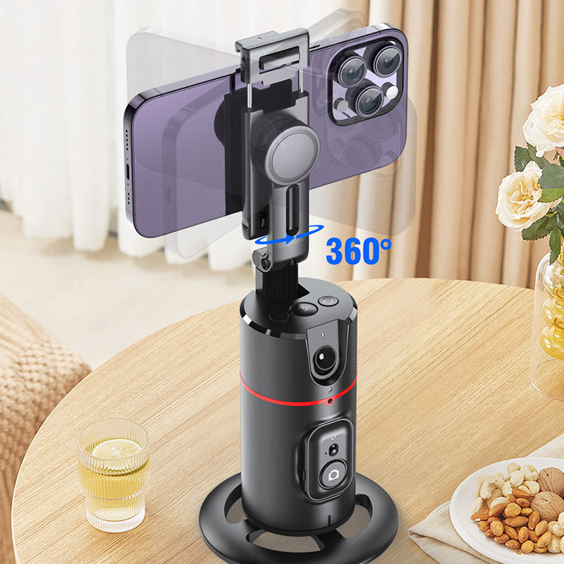 AUTOMATISCHE GEZICHTSHERKENNING: Deze houder voor smartphones ondersteunt het volgen van gezichten en lichamen met behulp van AI-herkenningstechnologie. Dankzij het zeer gevoelige ontwerp draait hij automatisch 360 graden en volgt hij gezichten en lichaamsbewegingen, zodat je zeker weet dat je gecentreerd in beeld blijft. Met een slimme dual-axis structuur voor vloeiende tracking.