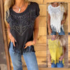 STIJLEND DESIGN: De hot stamping techniek voegt een vleugje glans en elegantie toe aan het effen T-shirt met korte mouwen voor dames, waardoor het geschikt is voor casual en semi-formele gelegenheden. De zoom met kwastjes voegt een speels en trendy detail toe en versterkt de algehele esthetiek van het T-shirt.