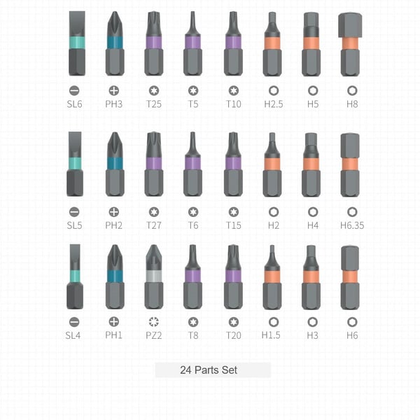 24 schroevendraaierbits gemaakt van industrieel S2 chroommolybdeen gelegeerd staal, continue warmtebehandeling. 5 soorten schroevendraaierkoppen voor professioneel gebruik, thuis, op het werk, doe-het-zelf en onderhoud. Arbeidsbesparend 6,2-graden ratelontwerp, 58-tands ratelstructuur met positieve en negatieve rotatie, waardoor 80% inspanning wordt bespaard.